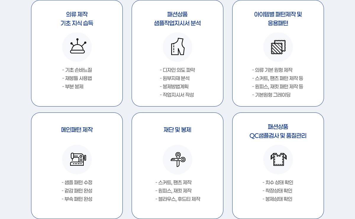 | ÈÆ·Ã°úÁ¤ °³¿ä | ÈÆ·Ã°úÁ¤¸í: ÀÇ·ù ¸®»çÀÌŬ¸µ ¹× ¾÷»çÀÌŬ¸µÀ» ÅëÇÑ ÆÐ¼Ç »óǰ Á¦ÀÛ ÈÆ ·Ã ³» ¿ë: ±âÃÊ ºÀÁ¦ ¹× ºÎºÐ ºÀÁ¦ / ÆÐ¼Ç ¼Òǰ Á¦ÀÛ / ¿©¼ºº¹ ¾ÆÀÌÅÛº° Á¦ÀÛ ¹× ¼ö¼± / ¿©¼ºº¹ ±â´É»ç ÀÚ°ÝÁõ ½Ç±â µî |